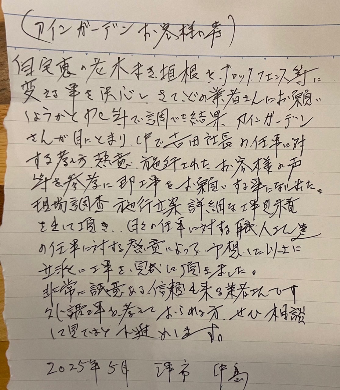 このたびはアインガーデンにご依頼いただき、また温かいお言葉と