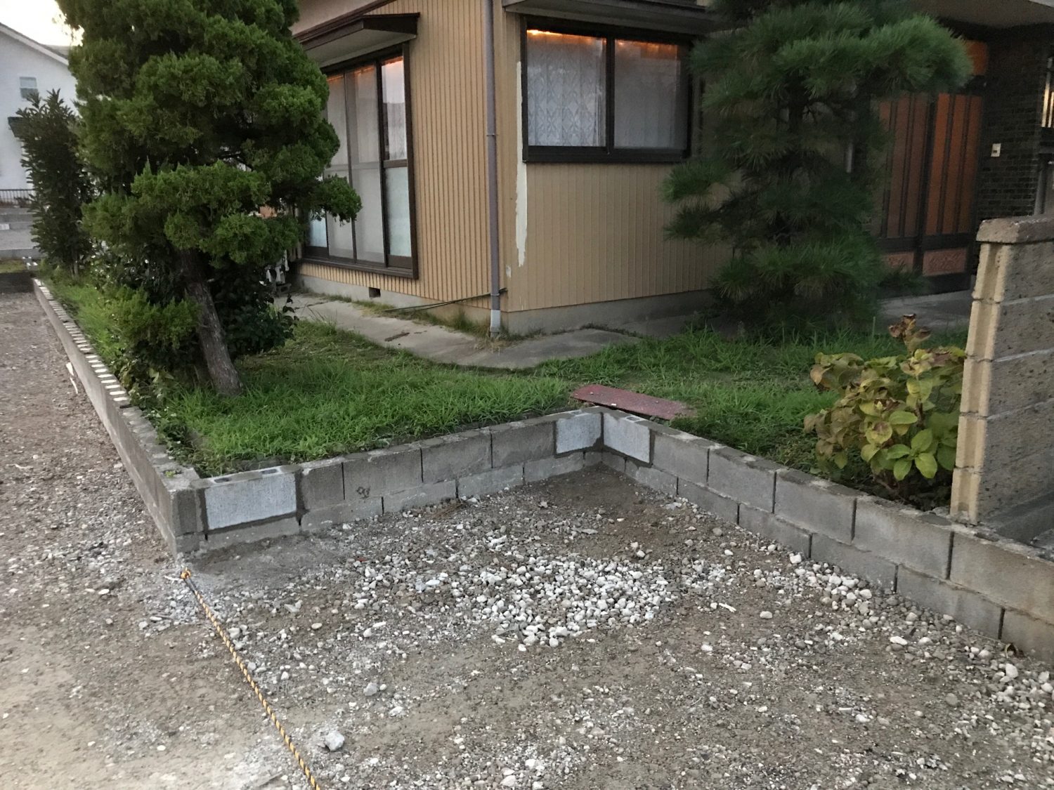 今日は上浜町にて、既存の境界ブロックにフェンスを付けるために準備をします。