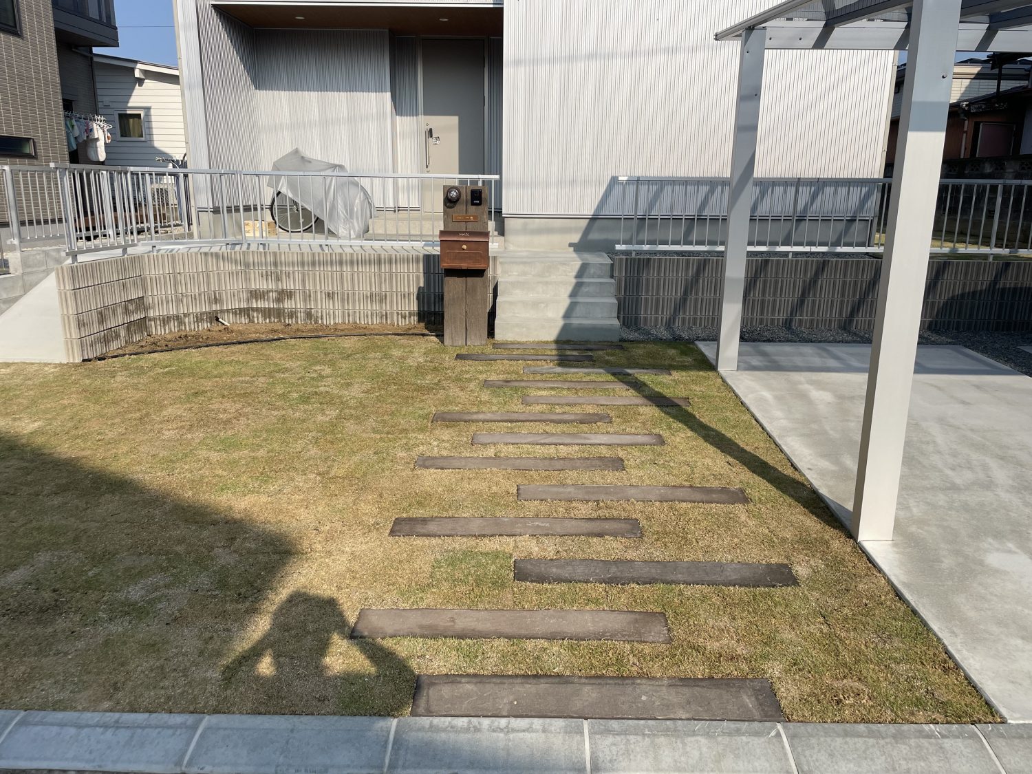 まずアプローチには、枕木をランダムに配置し、そのまわりを天然芝で仕上げました。