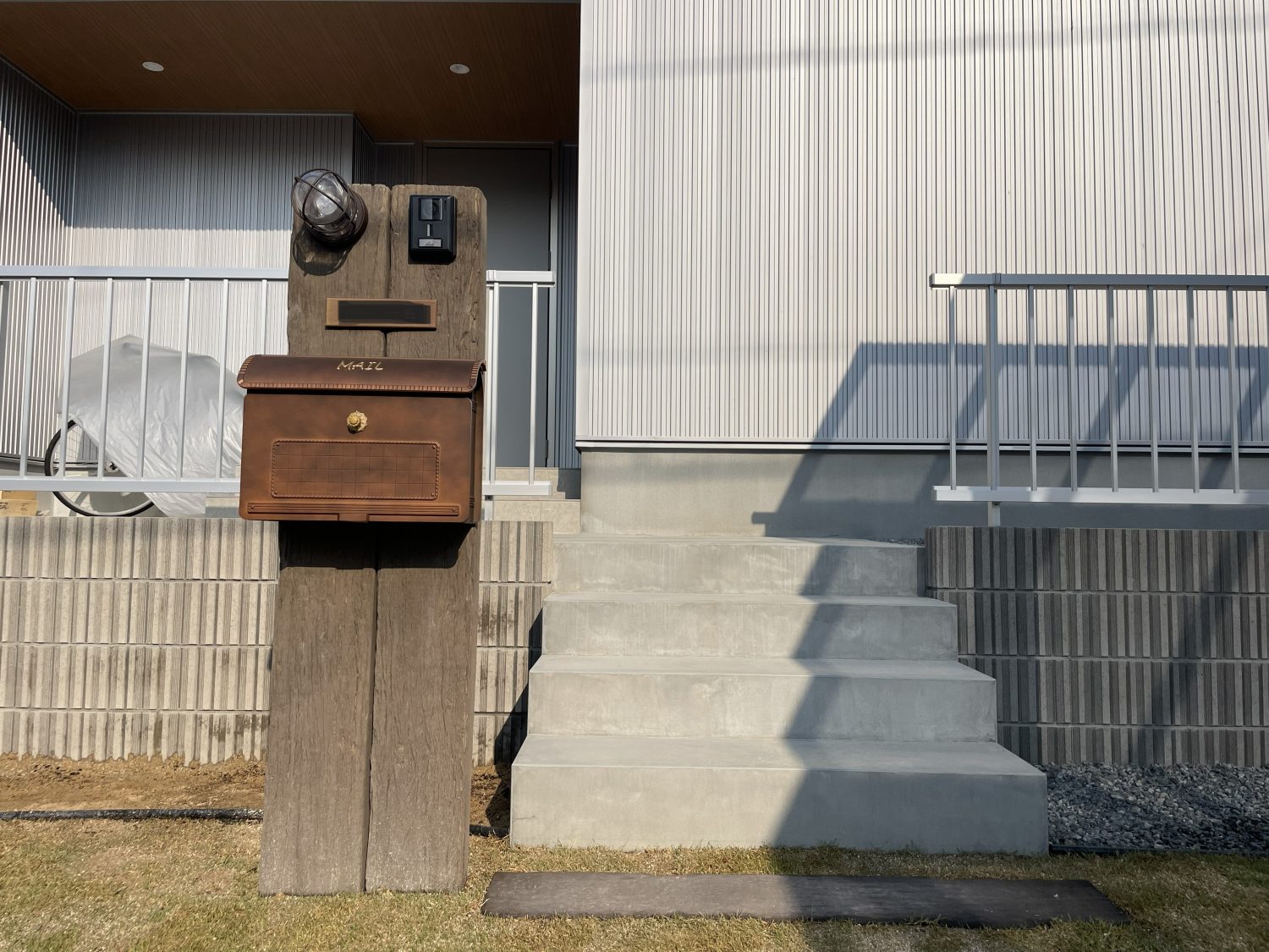 ポストは東洋工業の「ユーロバック」、門灯には「クリアマリンライト」を採用しました。